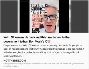 We told you yesterday about Keith Olbermann being insane and calling to ban Twitter and Apple dropping advertising on X.
