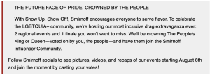 What people don’t realize is that for Smirnoff, this has been going on for a while. You see, Smirnoff US has been supporting LGBTQIA plus, plus, plus causes for at least the last five years (maybe even longer). They host a contest called, “Show Up. Show Off!” to find representatives from the drag community to spearhead the celebration of Pride Month (June) and be a part of the Smirnoff Influencer Community.