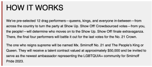 Show Up. Show Off!’s first competition (or at least the first that has been advertised) occurred in 2022 and a big party is planned for June 2023 to announce the winner(s). The Austin-based drag queen mentioned above, who goes under the name of “The Only Maxine,” is one of the finalists and appears to already be doing some paid partnerships with Smirnoff US.