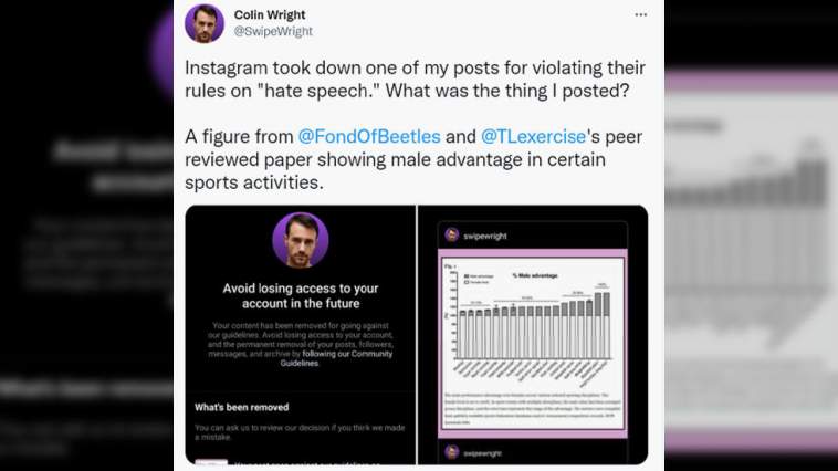 Colin Wright, an evolutionary biologist and the managing editor of Quillette, claimed on Tuesday that the social network had taken down his post referencing a “peer reviewed paper showing male advantage in certain sports activities.”