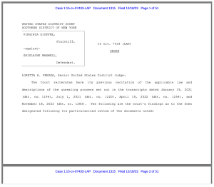 The tranche of documents will also include those referring to Annie Farmer, one of the women who gave evidence at Maxwell’s trial – she is identified as Doe 63 as Judge Preska cites an interview she gave and notes she testified under her own name.
