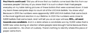 She said baskets of “military faxes” in Pima County were converted to actual ballots at stations with just one person.