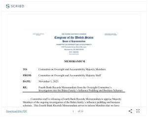Comer posted a video on X outlining bank records which show how various Biden family members took money from Chinese business associates and wired it to Joe Biden shortly thereafter.