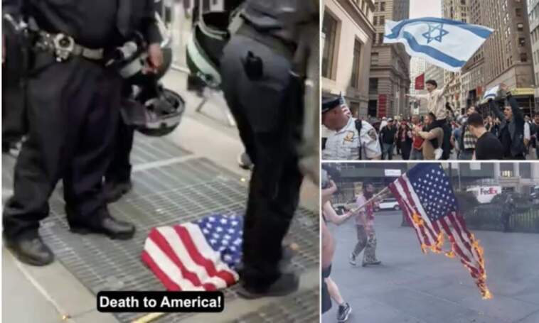 (Daily Mail) There were shocking scenes on the streets of New York City on Monday as Palestinian activists set fire to an American flag being held by Israel supporters while chanting ‘Death to America!’ right under the noses of the NYPD.
