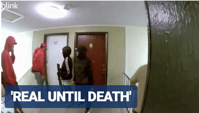 The video shows many men armed with handguns, and one with a scoped rifle, bursting through the door of the apartment complex for unknown reasons.