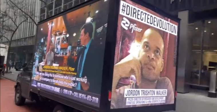 The truck’s displays feature messages reading, “#DirectedEvolution,” while playing footage of Veritas founder James O’Keefe viral confrontation with Pfizer Director of Research and Development for Strategic Operations and mRNA Scientific Planning Jordon Trishton Walker.