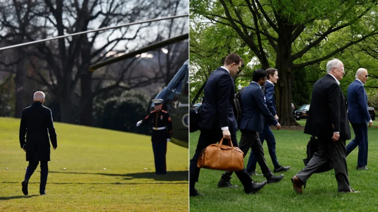 - Starting April 16, Biden was joined by staff or lawmakers nine out of 10 times he walked to and from Marine One.