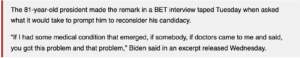 In several past interviews, Biden insisted that he was the nominee and that nothing but God could force him to withdraw. Yet, in a new interview with BET, the president directly stated that he would drop out if medical professionals advised him to.