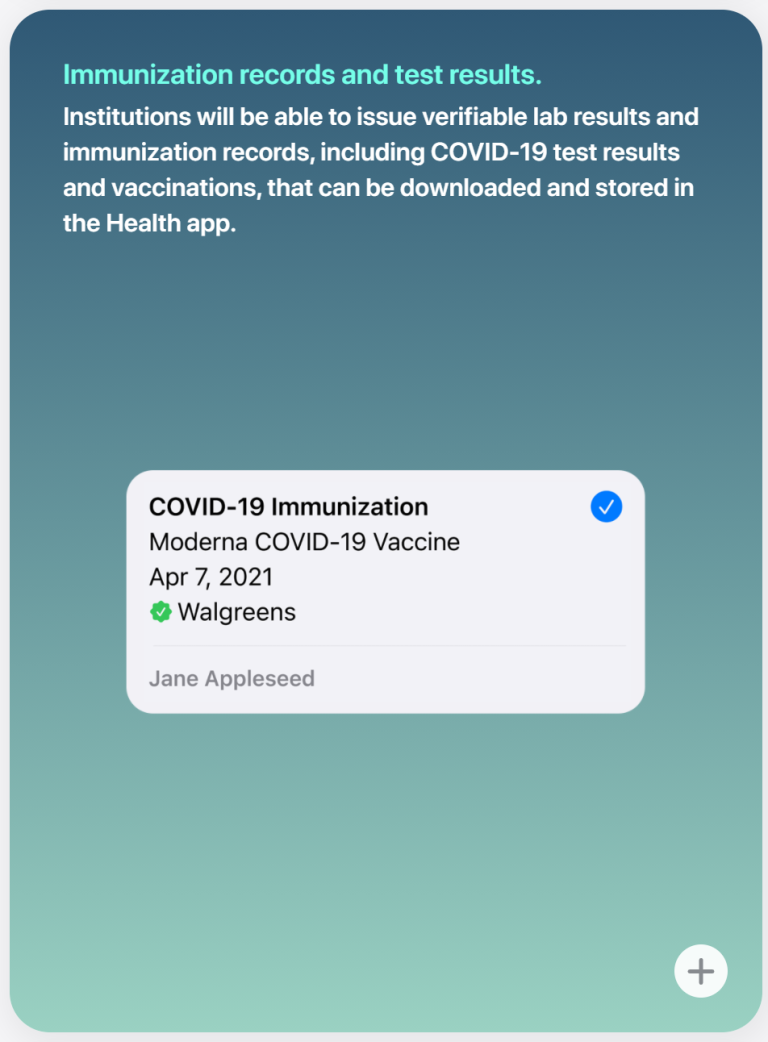 According to Apple’s website: “Institutions will be able to issue verifiable lab results and immunization records, including COVID-19 test results and vaccinations, that can be downloaded and stored in the Health app.”